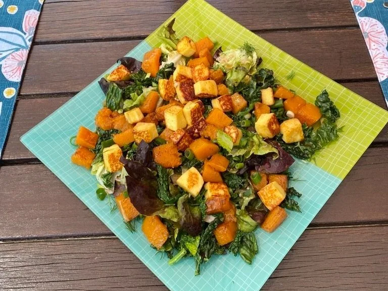 Lay a bed of a variety of greens on a dish - as much as you fancy, add the pumpkin and the Haloumi, sprinkle with herbs and green onions.